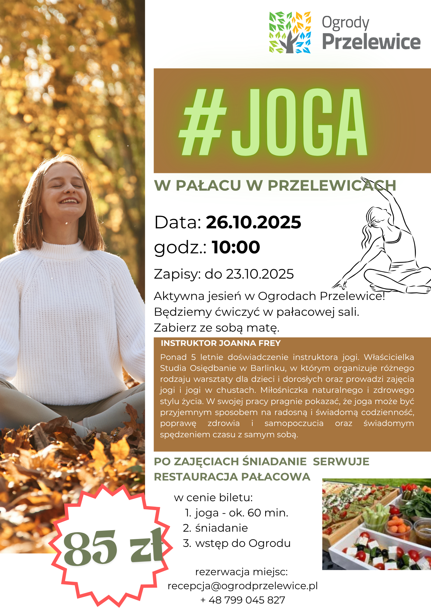 🌿 JOGA W PAŁACU W PRZELEWICACH 🌿 Zapraszamy na wyjątkowe zajęcia jogi w magicznej atmosferze Pałacu w Przelewicach! Zajęcia poprowadzi Joanna Frey instruktorka z ponad 5-letnim doświadczeniem, właścicielka Studia Osiędbanie w Barlinku. Organizuje warsztaty dla dzieci i dorosłych, a także prowadzi zajęcia jogi i jogi Po zajęciach zapraszamy na pyszne śniadanie serwowane przez Restaurację Pałacową. Przyjdź, zrelaksuj się i zadbaj o siebie w otoczeniu pięknej przyrody! Pamiętaj! Zabierz ze sobą matę do jogi!