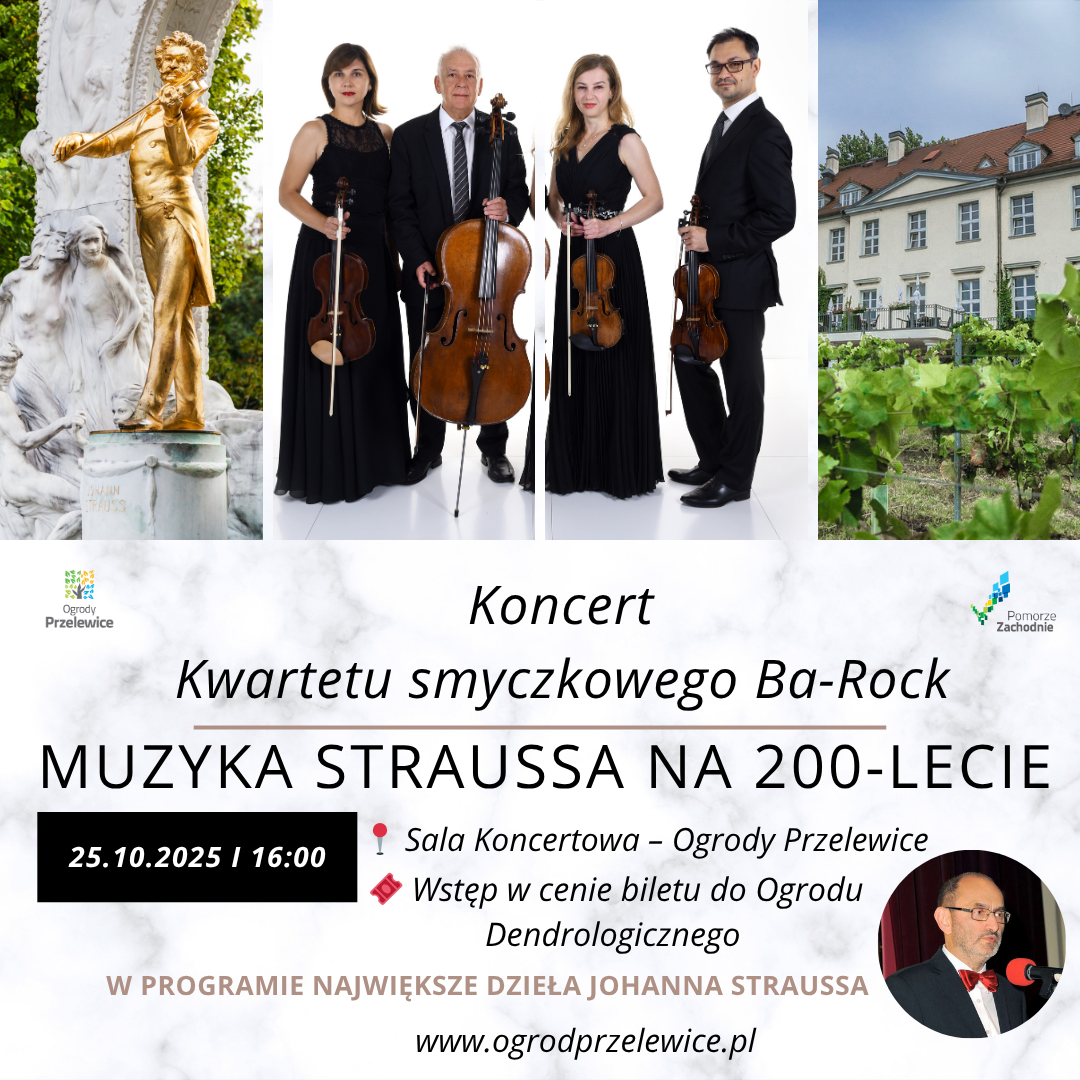 Zapraszamy na niezwykłe muzyczne popołudnie z muzyką Johanna Straussa! W eleganckich wnętrzach zabytkowego Pałacu rozbrzmią najsłynniejsze walce, polki i marsze wiedeńskiego mistrza. Misza Tsebriy – I skrzypce Kwartet smyczkowy Ba-Rock W programie m.in.: Wystąpią muzycy, którzy przeniosą nas wprost do salonów XIX-wiecznego Wiednia. Koncert to idealna okazja, by połączyć kulturę z relaksem w Ogrodach Przelewice. Pokaż mniej
